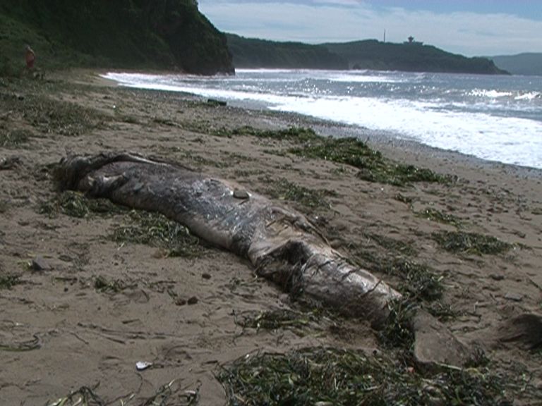 В этом трупе, облепленном мухами, едва угадывается одно из красивейших морских существ. Специалисты, которые уже побывали на месте, говорят, тело принадлежит киту полосатику. Длина безголового трупа около 3 метров. Голову, как предполагают специалисты, киту срезало винтом судна. Некоторое время труп находился в море, пока штормовой волной его не вынесло на пляж. У кита отсутствуют плавники, скорее всего, объели рыбы. На берегу мертвый кит-полосатик находится уже сутки. Труп источает нестерпимый запах и его уже начали объедать мухи. Что с ним делать, предприниматели, арендующие территорию пляжа, не знают. Напомним, в начале прошлого лета в бухте Анна и у берегов острова Лисий были обнаружены два трупа китов-полосатиков. В отличие от найденного во Врангеле, они не имели внешних повреждений. Причина же смерти малых полосатиков так и неизвестна. Экологи делали предположения о причастности военных к гибели морских животных, но руководитель Группы информационного обеспечения ТОФ эту информацию опроверг.Информационное агентство «Каскад-Находка» специально для «Восток-ТВН» 2012г. Корреспондент: Шарипова Анна, Видеооператор: Гринчак Денис, Монтаж: Евсеев Евгений |